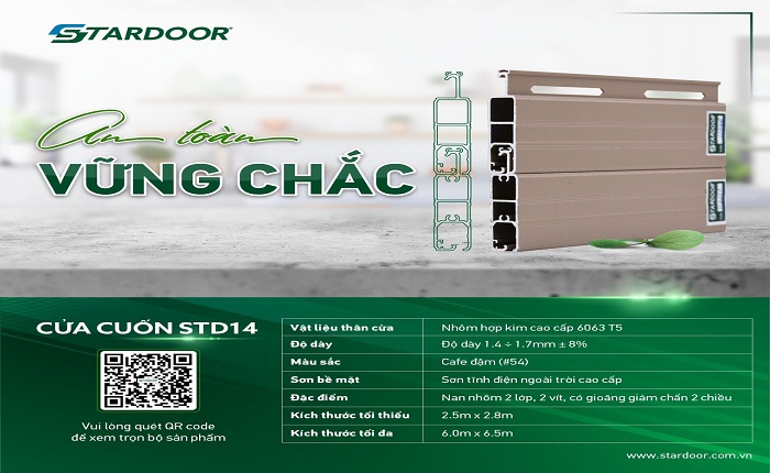 Chất liệu: Cửa cuốn nan nhôm Stardoor STD14 được làm từ hợp kim nhôm cao cấp 6063 T5, giúp chống ăn mòn và bền bỉ theo thời gian.